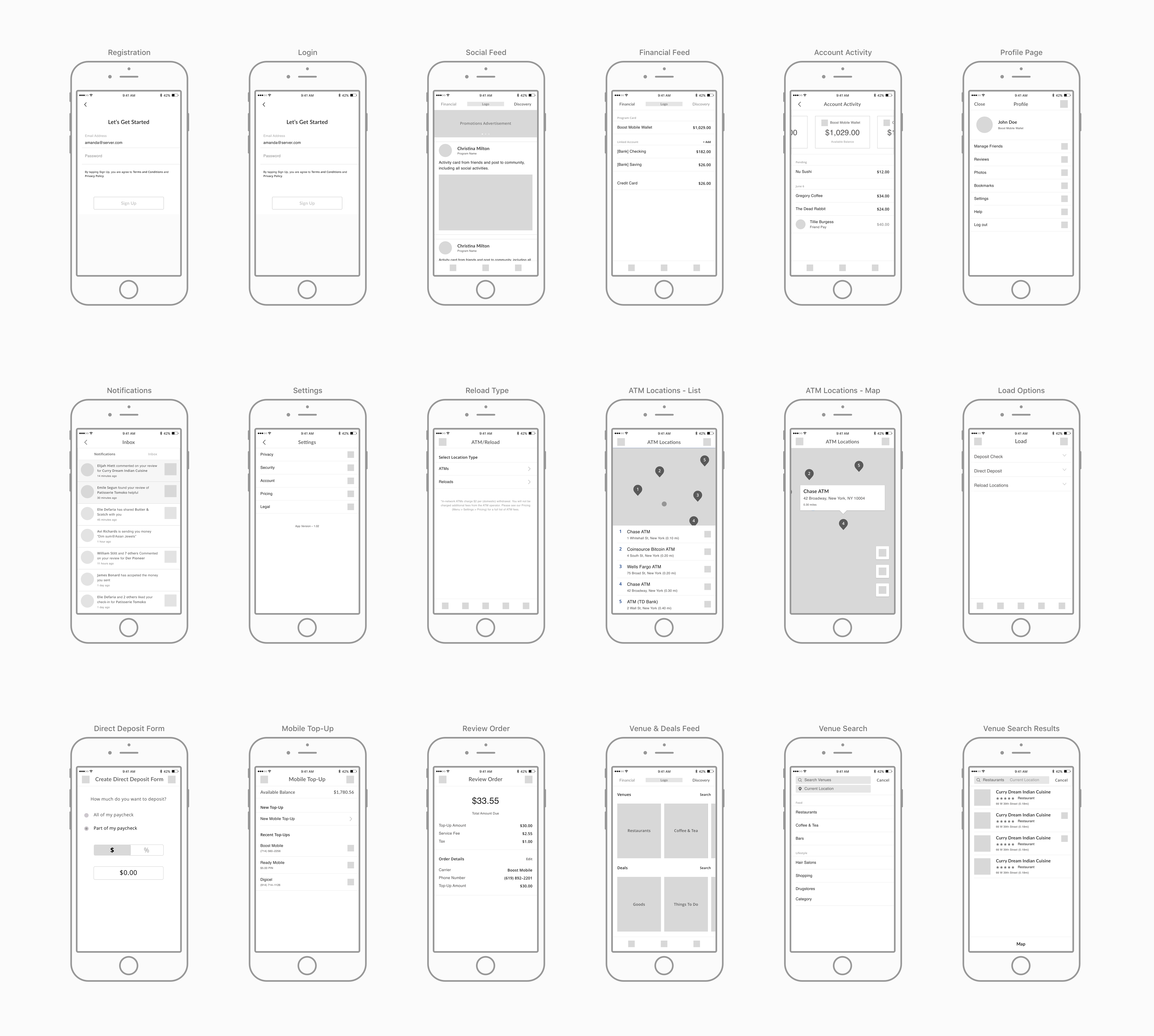 While producing the wireframes, we conducted the another round of user test with the draft low fidelity wireframes to see whether there was some usability issue and also once again to confirm whether the user flow made sense. We asked users to perform the tasks. I observe, document and analyse user's behaviors and questions. When reading the notes I took down, the second round of user testing gave us some really valuable feedbacks. Switch from financial info and social feed is easy to navigate from landing homepage. And it is very unclear for users how to split bill from the spend. Social Feed and Venue/Deals homepage look very similar thus confusing, it was hard for users to tell the difference at the first sight. The export button will be mistaken with share button, etc.