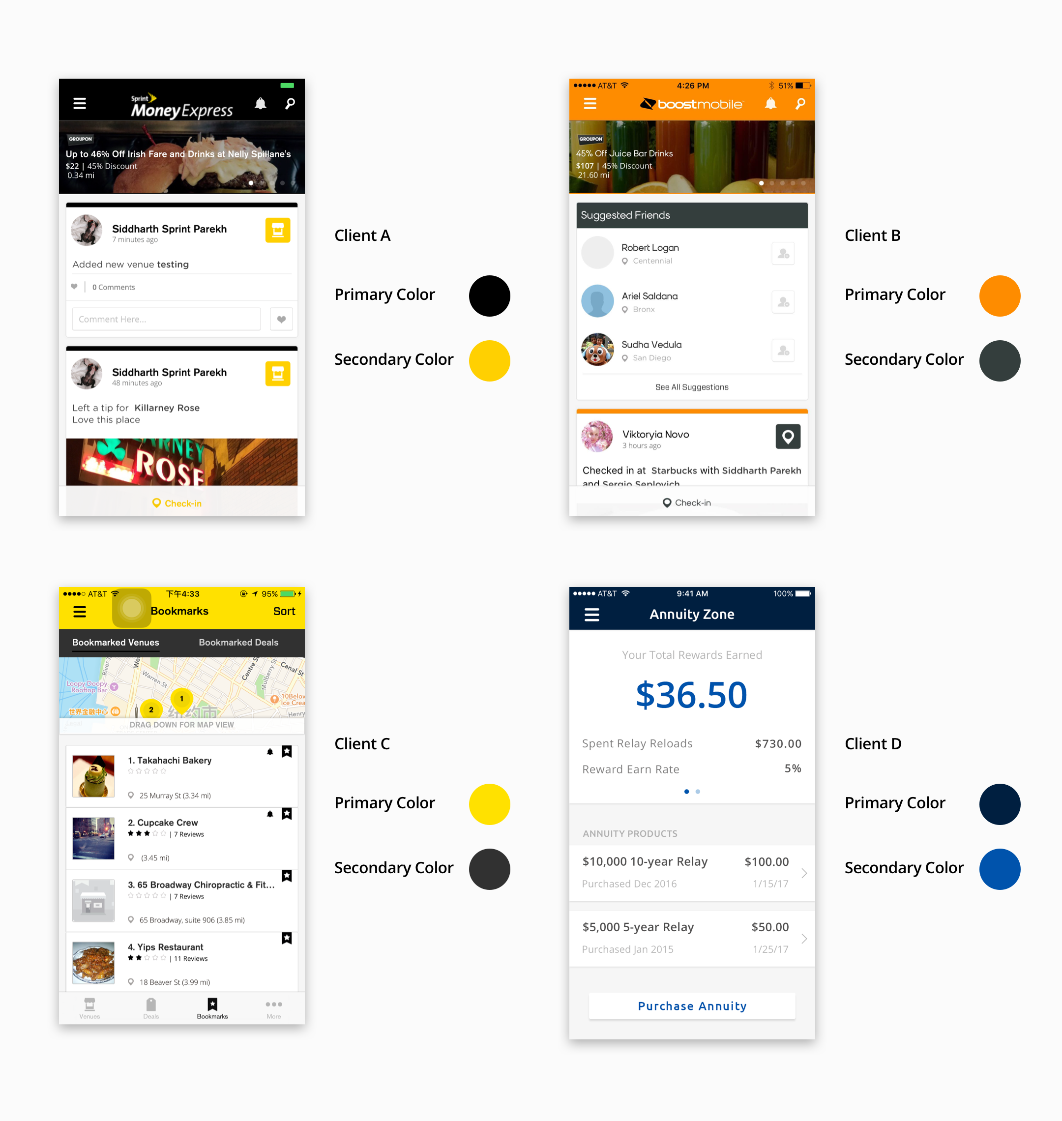 Troubles with the color palette were the first thing came to me. As a B2B company, Urban FT provides customized features to clients including color palette. However, it'll become troublesome for us to design and also no good for our branding identity. Some clients app screens are like these: