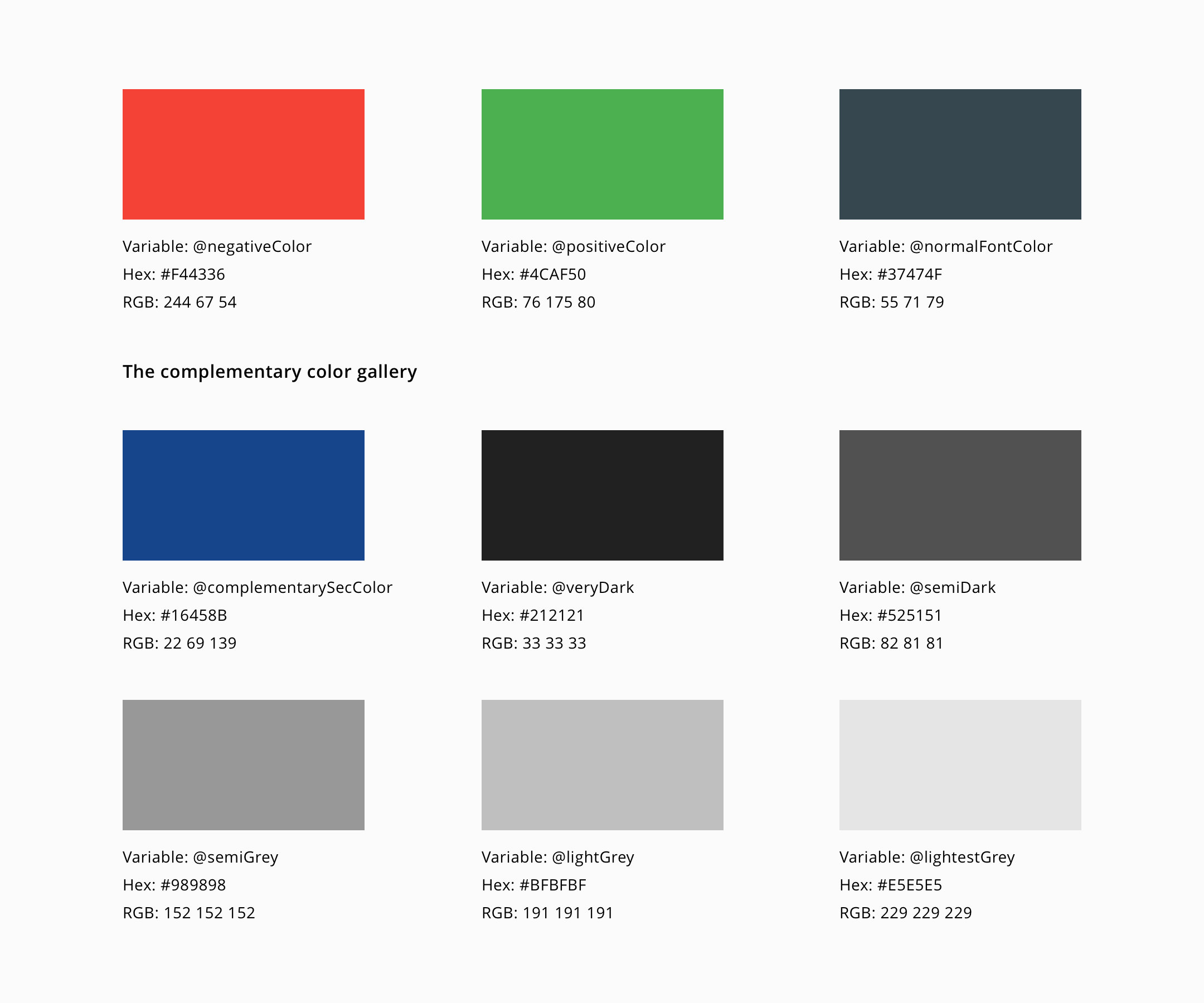 It's not ideal to create color palette for each indivual client, so our solution is to have a complementary color palette to match to most of clients' primary and secondary color choice - assuming they already have their branding color, if not we'll bring up our color suggestion for them as well. Below is a clip from the complete color libary