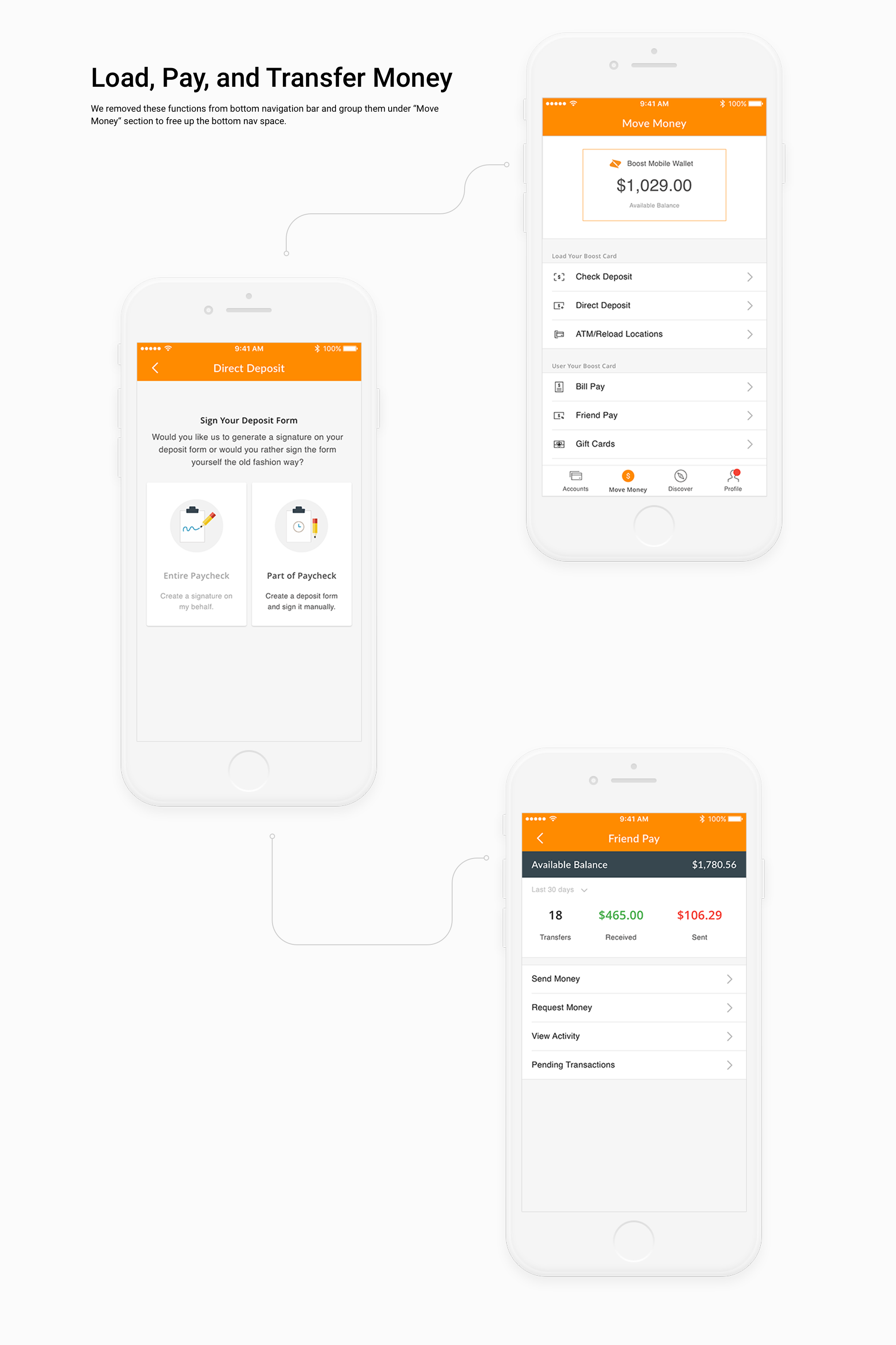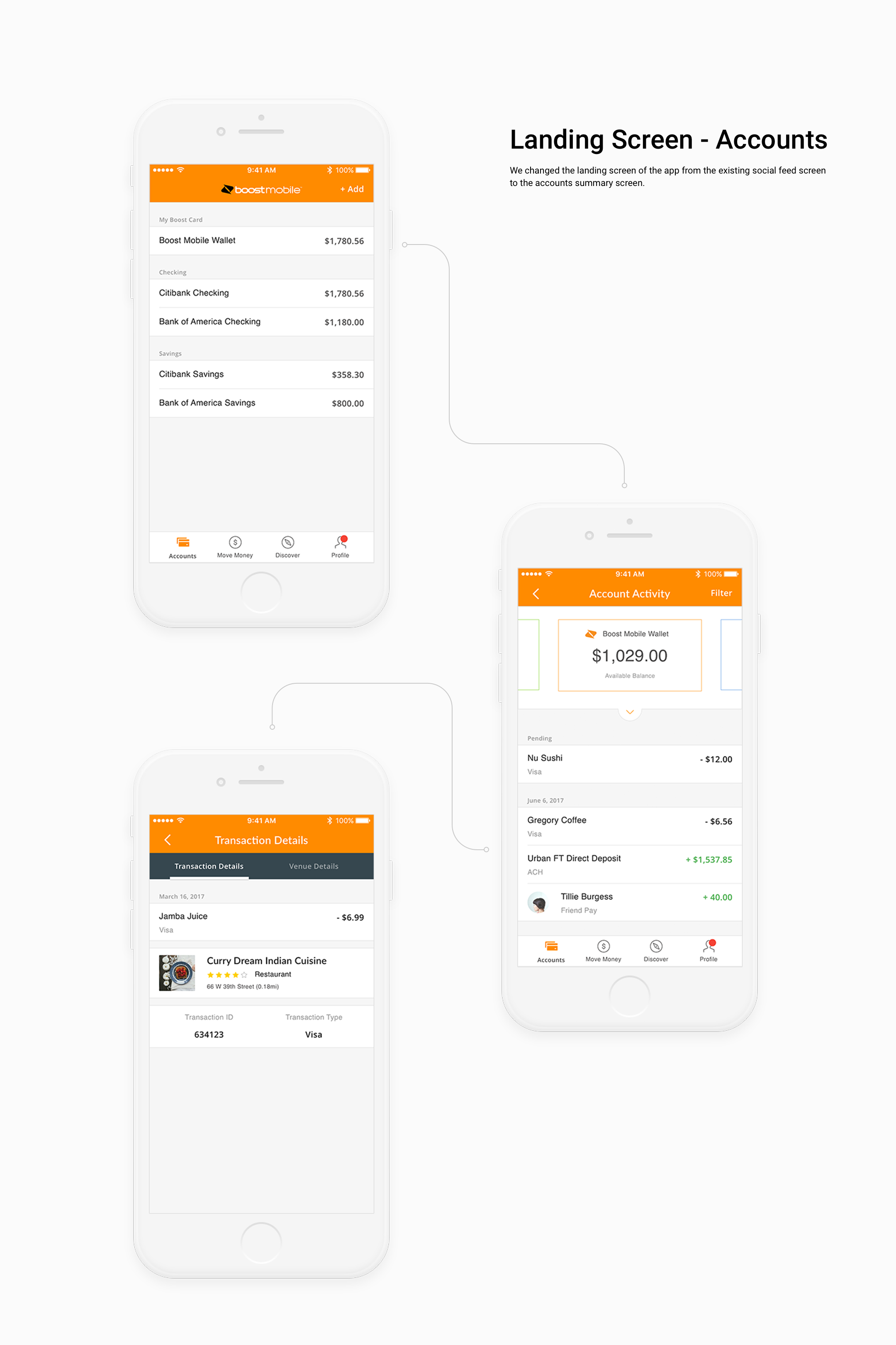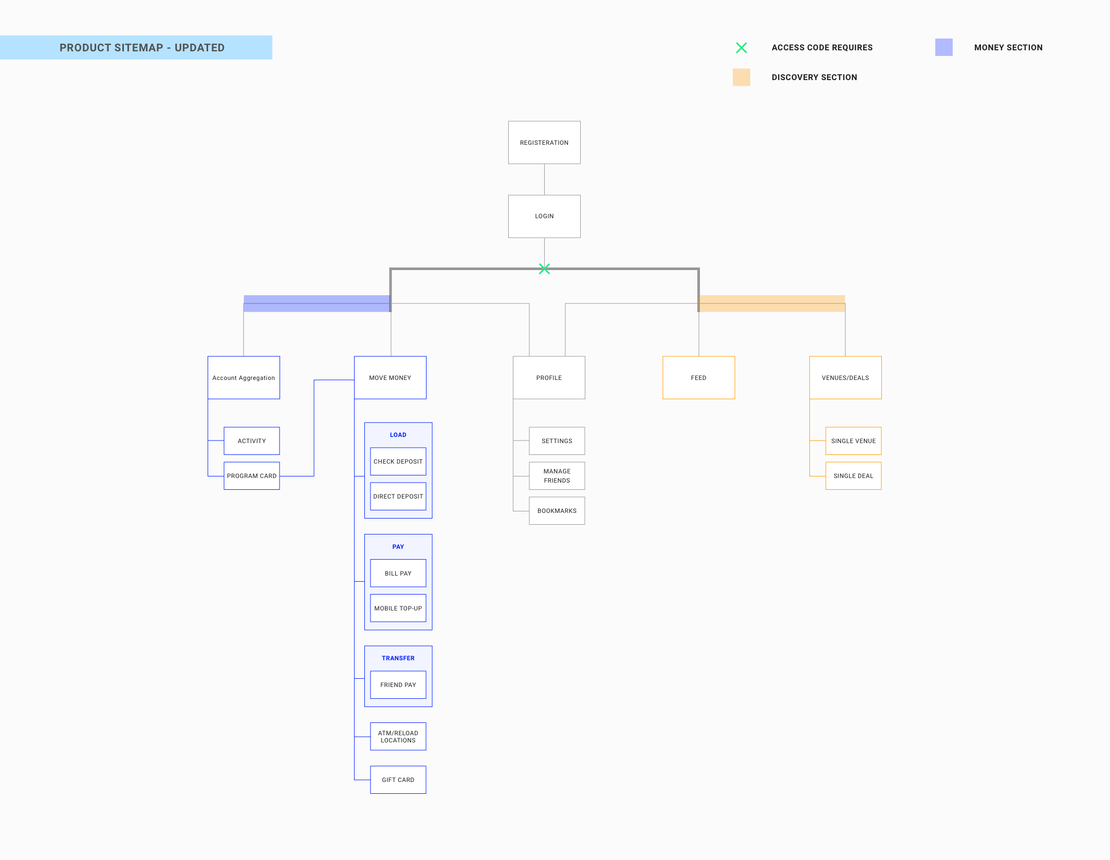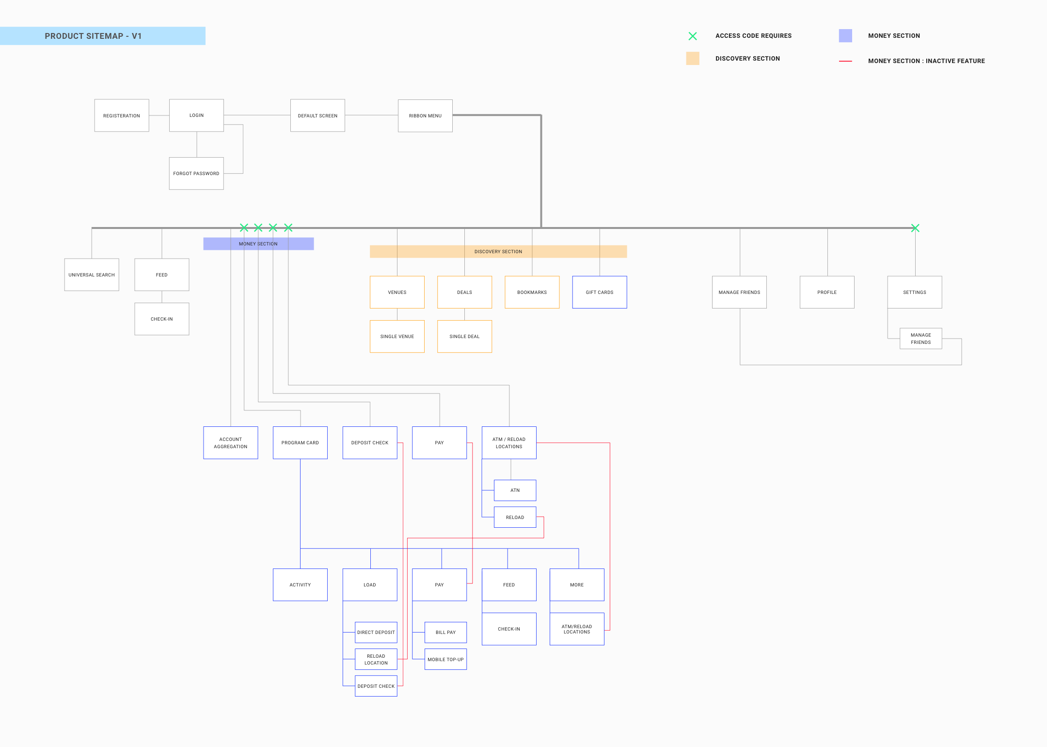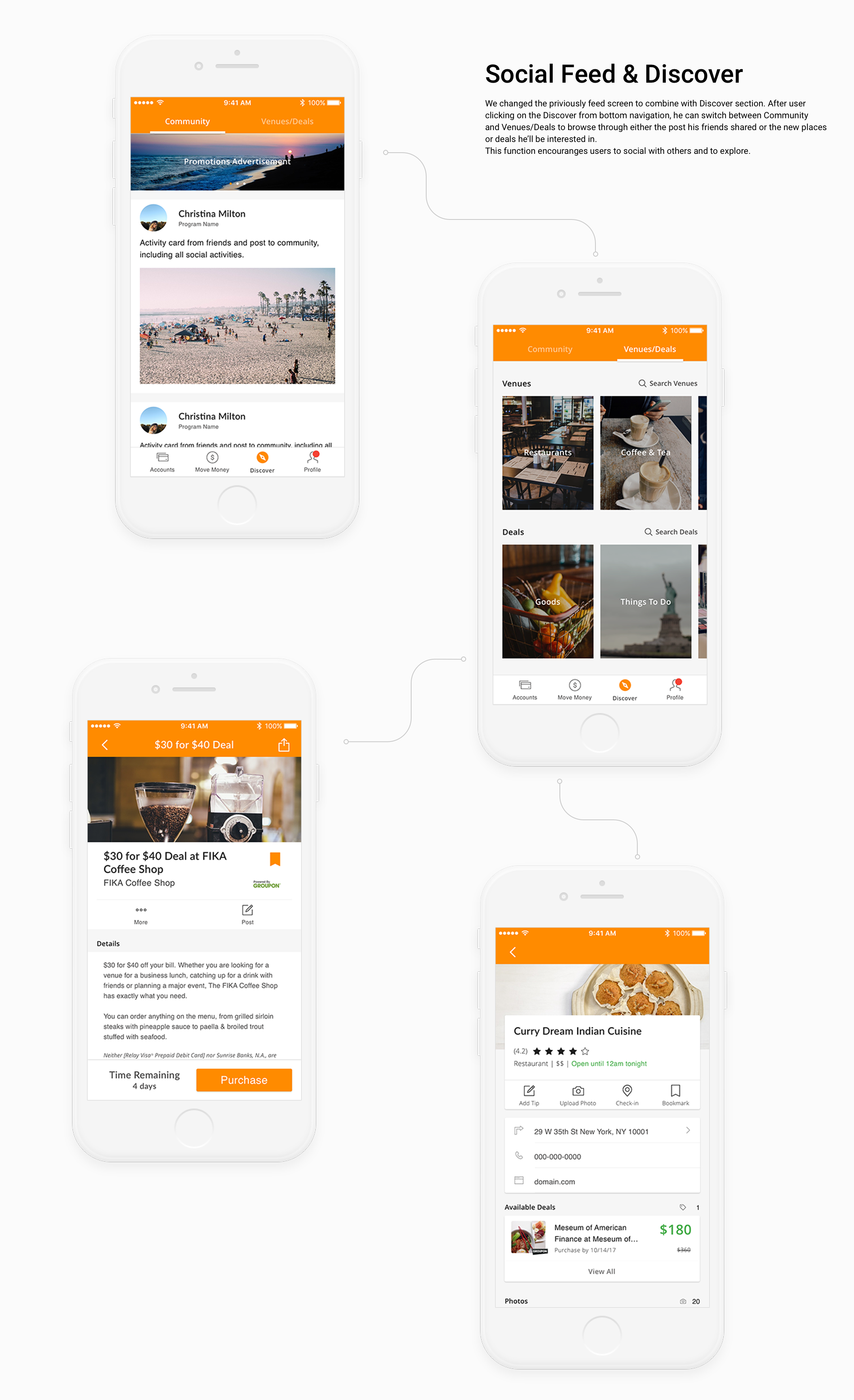 Based on the feedbacks we gained from card sorting and analysis, we brainstormed how to improve the current user flow. We came out 4 main features - finance, social, feed and profile. Among these, finance and social are two largest feature to focus on.In order not to increase the usage of other sections and not to make them feel like independent ones, we added some new features in social section to encourage user to employ the card so it got related to the Financial section. And I modified the original feed area for its updated design on just post thought or photos. Instead, the feed feature would be for sharing places or deals to users, or add a post where you hang out with friends and tag them, owhich was supposed to encourage the user to add an action.