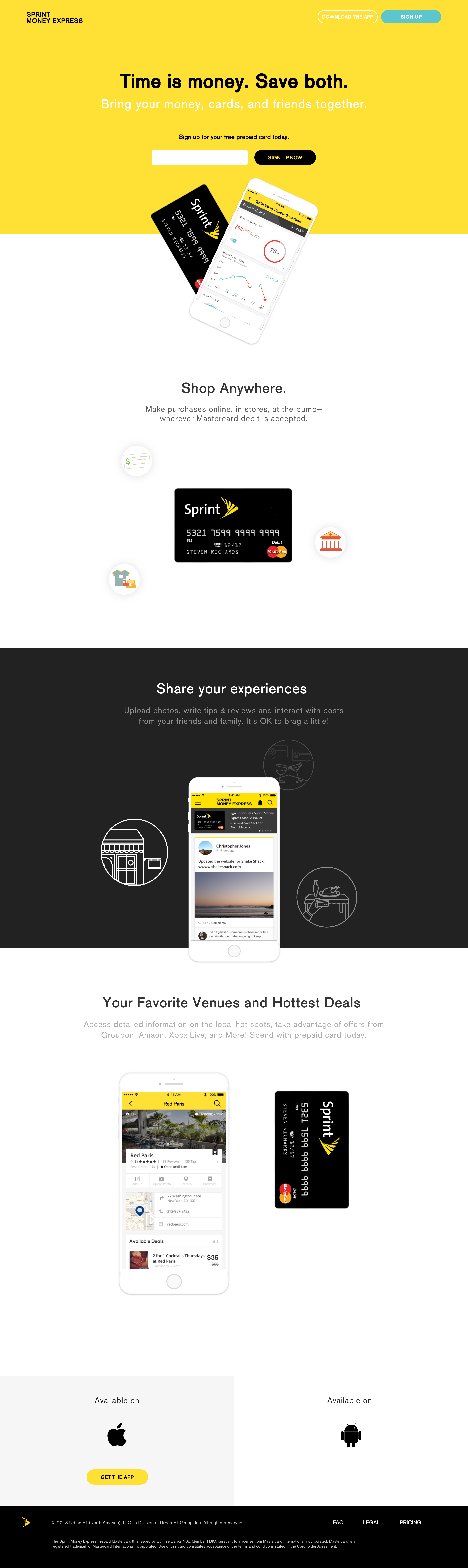 Sprint MoneyExpress enables user to sign up a prepaid debit card, and users can download the Sprint MoneyExpress app to track the usage of the card, while it also comes with social features. Client wanted the website to be clean, clear and fun.