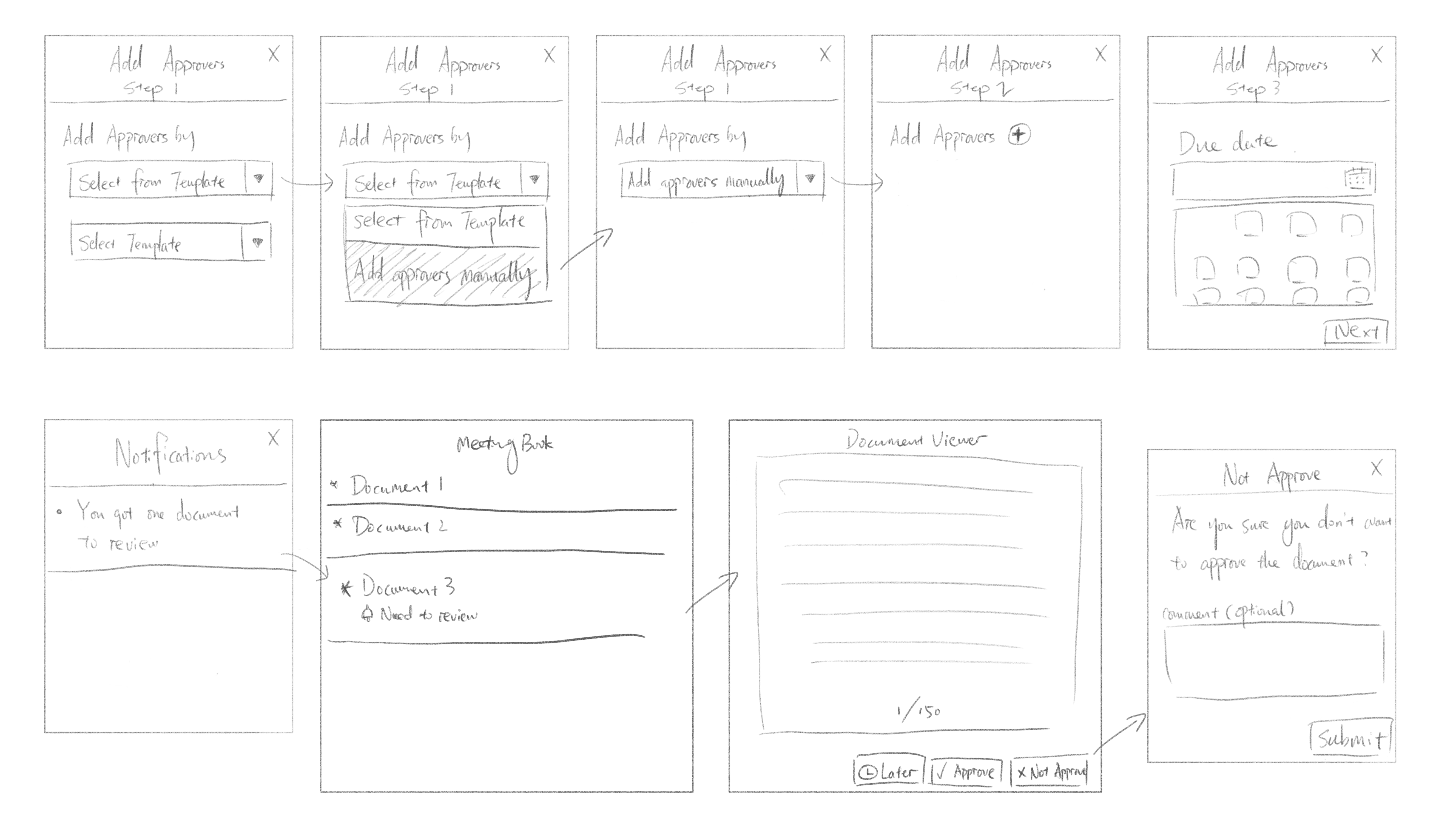 I mapped out the user flow as the start. From the initial user feedback, there are two use cases for the approval process. When Administrator reach out to board directors to ask for approval feedback, the directors may submit their response individually, or respond in sequence - meaning the directors would only be able to review the meeting document after the previous director approved it.